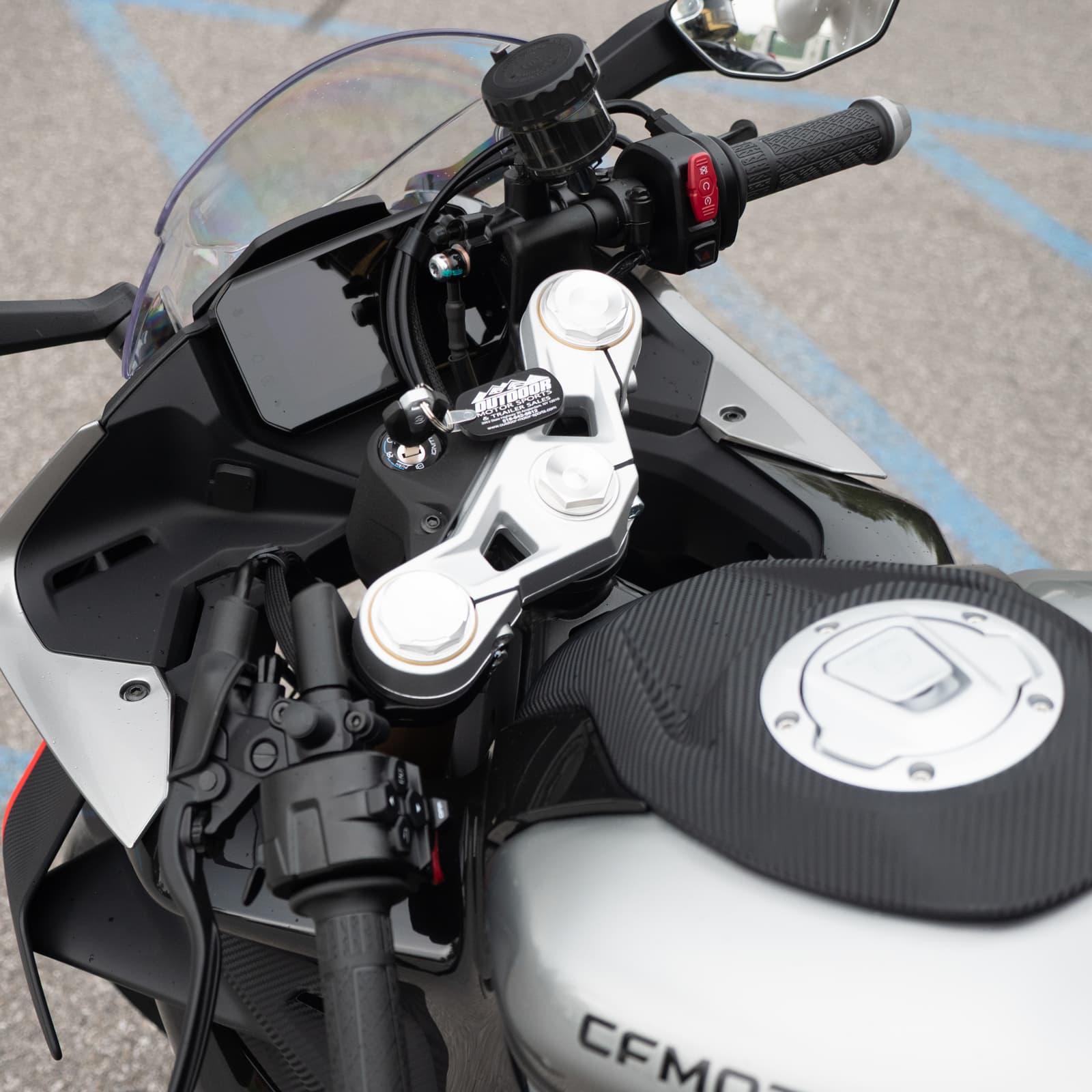 Electronics: 5-inch curved TFT display with Bluetooth and CFMOTO RideSync connectivity.